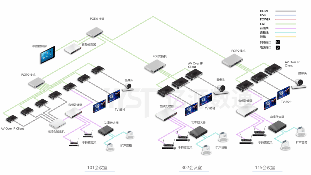 YYST 亿源数通提供的会议室 AV 音视频系统架构,为这个难题带来了解决办法。通过这套架构,企业的会议管理人员在中控控制室,就能远程管理各个楼层和会议室,灵活分配视频会议主机、拾音扩声等资源,让会议安排更加灵活高效。
