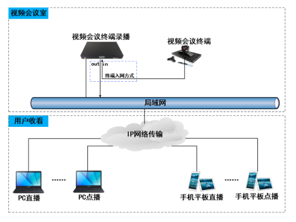 目前,一些视频会议室的录播解决方案,多采用硬盘录像机、模拟录播等设备,对视频会议终端的输出进行二次编码来实现录制。但这种方式存在明显缺点:二次编码会导致图像和音频效果变差,接线复杂;且终端本身不具备输出本地音频的功能,需要额外添加音频设备,录制管理也较为繁琐,每次都要手动操作开始录制。