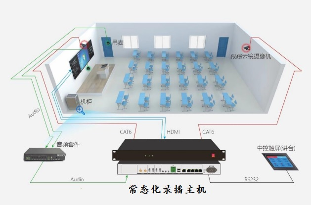 常态录播方案由主机搭配 2 个 4K 云镜摄像机、2 个吊麦及中控屏组成,为教育领域的视频会议及相关教学活动提供了便捷、高效的硬件支持。