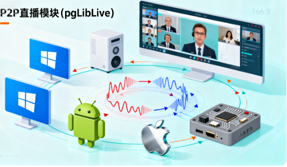 P2P 直播模块(pgLibLive)基于 P2P 传输功能打造,集成视频音频直播处理逻辑(含采集与播放),是适配多系统、多场景的视频直播开发包,不仅能支撑常规直播需求,还可融入视频会议场景,为会议直播、多端音视频交互提供稳定传输与灵活适配能力,助力企业快速搭建定制化音视频协作功能。